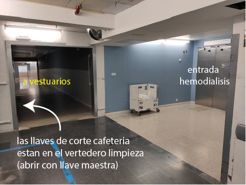 En la esquina entre entrada a hemodialisis y la bajada a vestuarios hay un vertedero en la que corta toda la instalacion de cafeteria (la puerta se abre con la llave maestra)